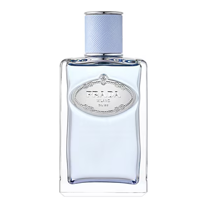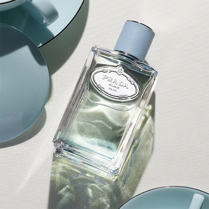 The luxurious bottle of Infusion d’Amande is highlighted in a blue-tinted hue, evoking the fusion of the signature ingredient in the fragrance. The tender blue cap in iconic Saffiano symbolizes the delicacy of the almond in the fragrance.